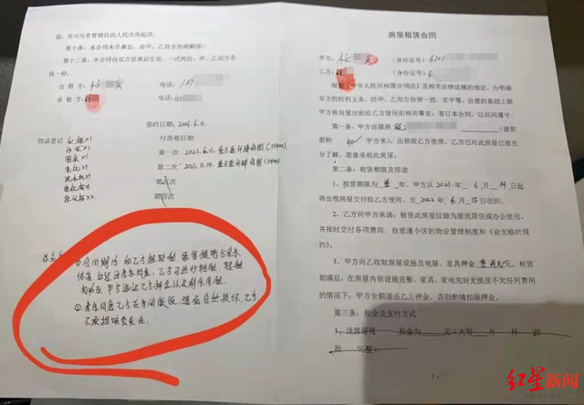 程程父亲程先生向红星新闻提供的程程和任某寅于今年6月11日签订的《房屋租赁合同》显示,租赁合同为一年,即2021年6月14日至2022年6月13日。押金是3000元,租金分两次支付,即2021年6月11日,支付11400元。2021年11月14日支付11400元。